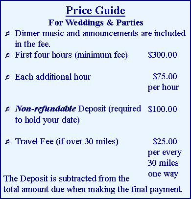 Pirate Enterprise DJ Service has been in business since 1991, with a collection of over 9,000 songs in a variety of genres including : Rock, Hip Hop, Alternative, Ska, Rap, Dance, Techno, Country, R&B, 50's & 60's, Disco, Ballroom, and Adult Contemporary.